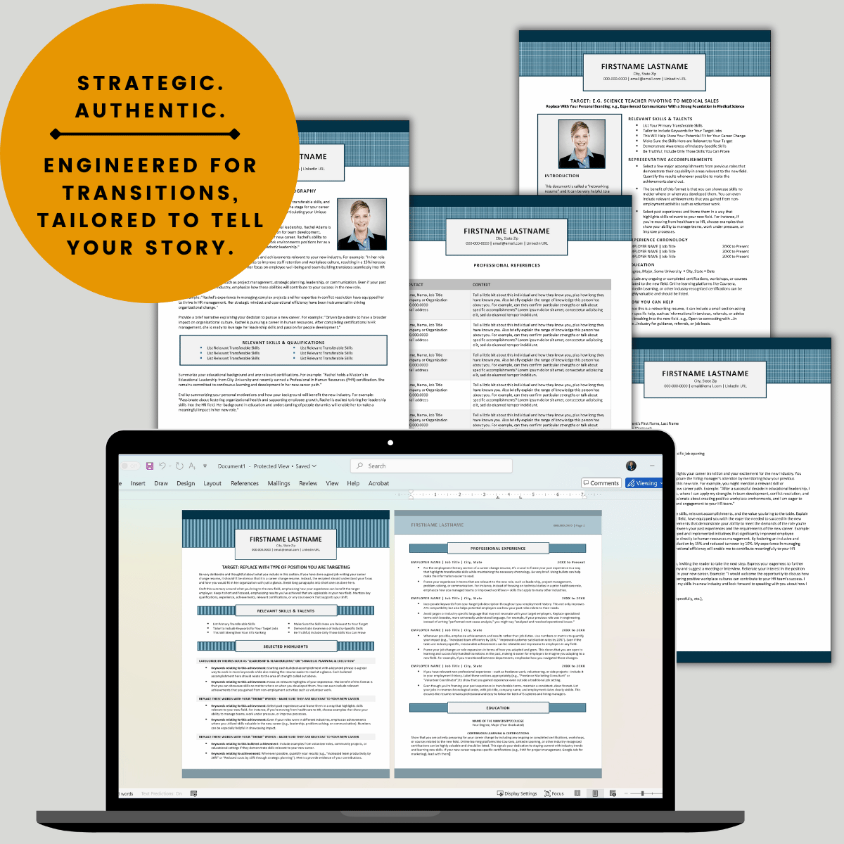 Plus, each template includes tips and prompts to help you know what to write. Transform your boring, unattractive, hard-to read career documents into eye-catching, engaging masterpieces. All the templates can be easily customized – both the color and format – to make them your own. 16 templates in all; 4 to match each of the 4 resume templates in the Career Change Resume Writing Toolkit. Microsoft Word is required.