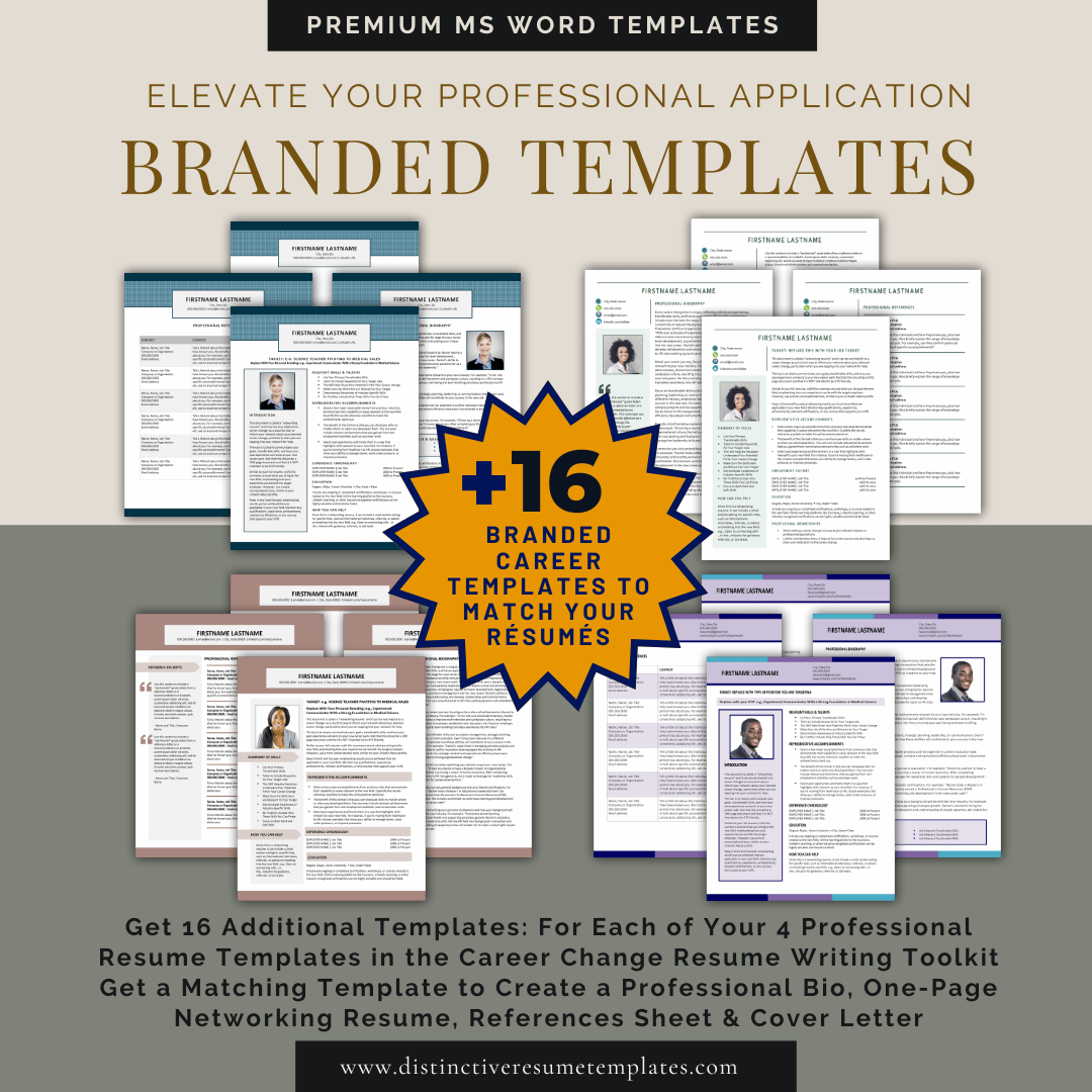 4 Matching Professional Biography, Networking Resume (a one-page document used for networking), References Dossier & Cover Letter Templates in Designs that Perfectly Match the 4 Resume Templates in Your Career Change Resume Writing Toolkit.