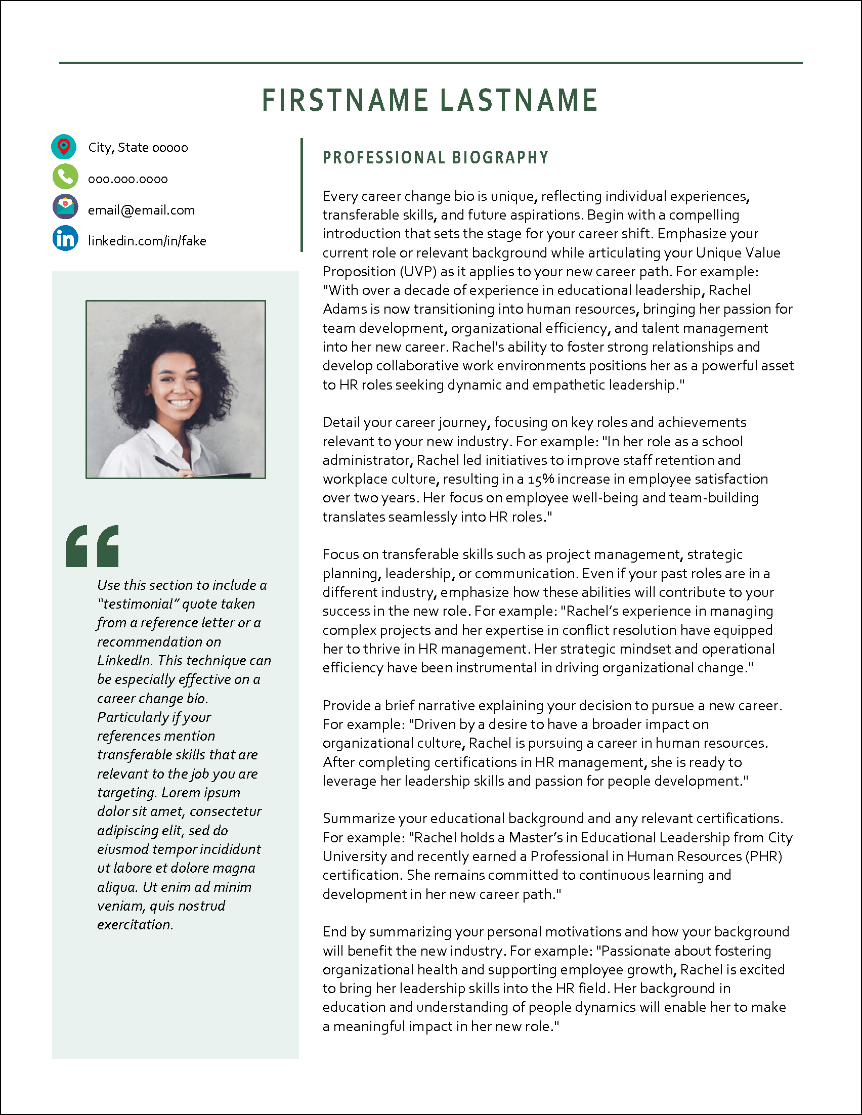 The Professional Biography Template guides you in crafting a narrative that eloquently explains your career evolution and the valuable perspective you bring to your new field. It's an ideal format for LinkedIn profiles, speaker introductions, or website content.