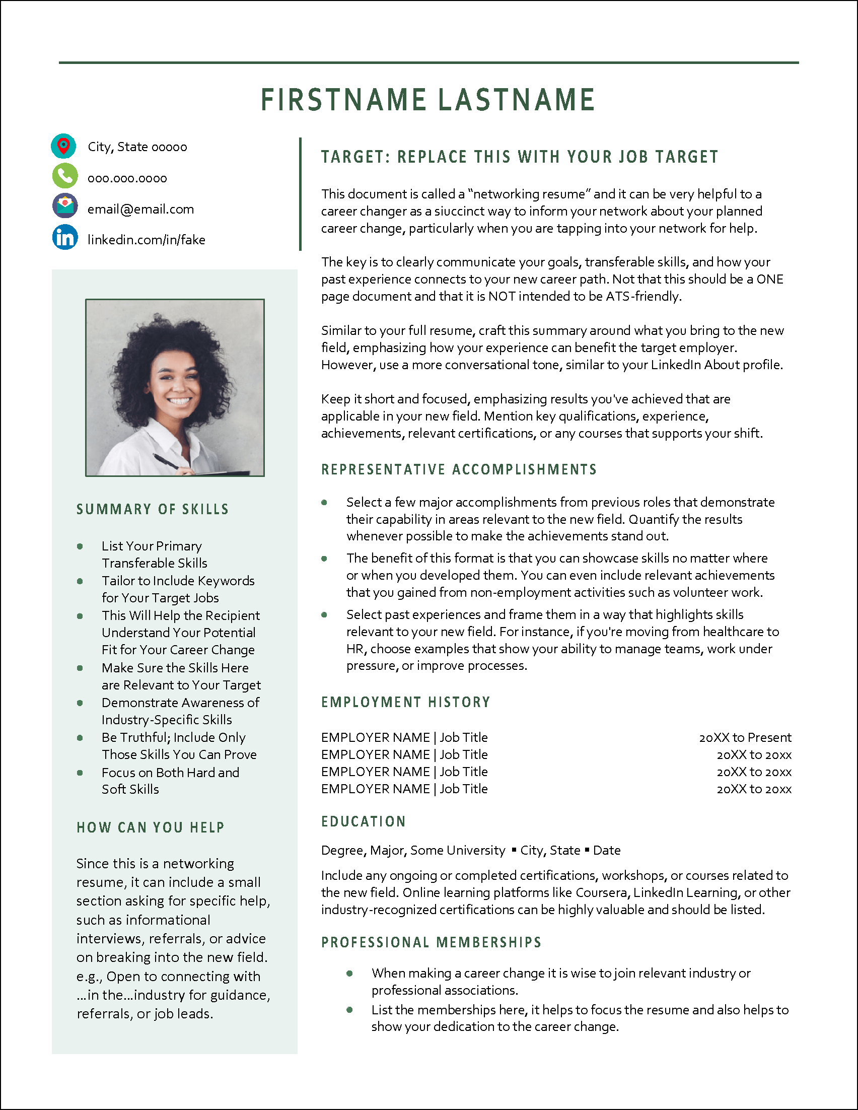 The Networking Resume Template condenses your experience into a powerful one-page format, perfect for networking events and quick introductions. It helps you make an immediate impact by highlighting your most relevant transferable skills and achievements.