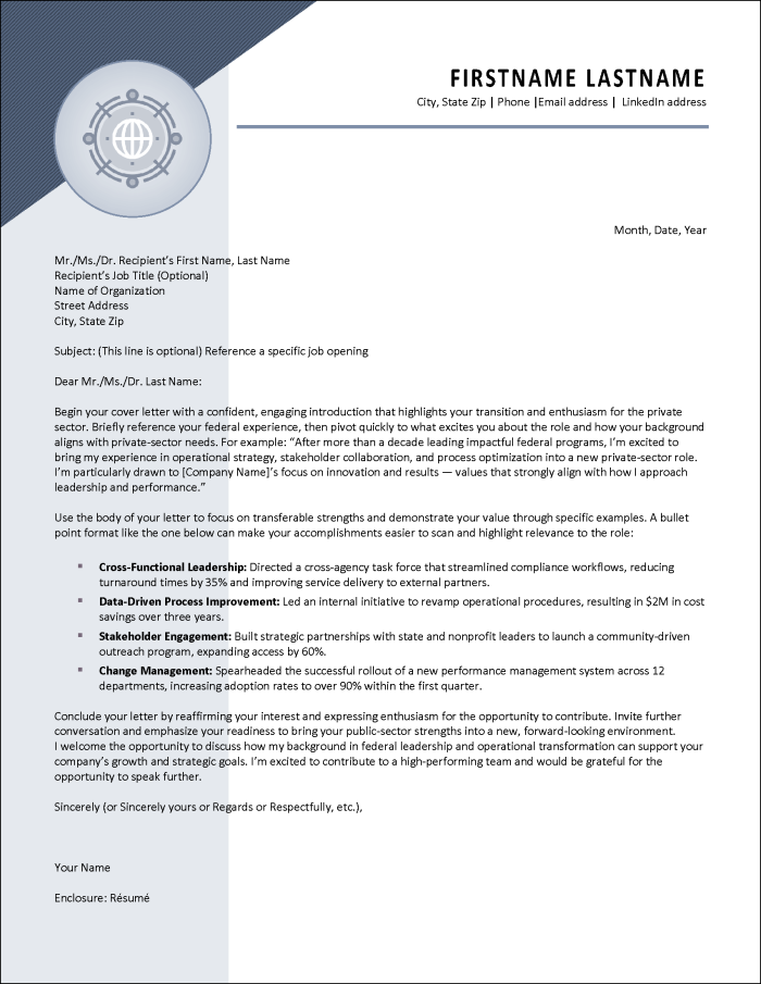 The Cover Letter template provides the perfect framework for introducing yourself to private sector employers, with guidance on effectively connecting your government experience to their technical requirements and business goals.