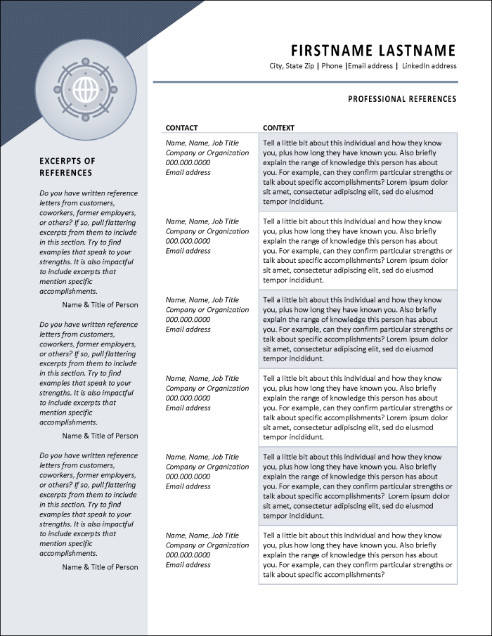 The Professional References document template ensures your references are presented with the same attention to detail and professional styling as your other materials, creating a cohesive impression with potential employers when they reach this critical stage of the hiring process.