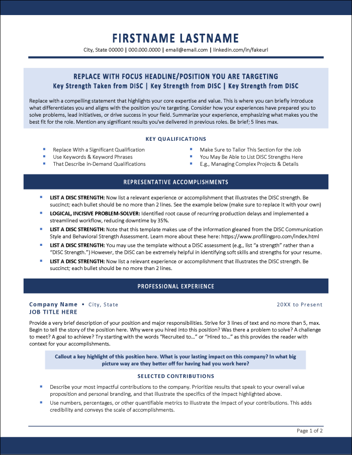 Don't have a DISC assessment? No problem! While the DISCPro template includes special sections for incorporating DISC insights, it works beautifully as a standalone resume template as well. We even provide guidance on how to obtain a DISC assessment if you're interested in adding this powerful dimension to your job search strategy.