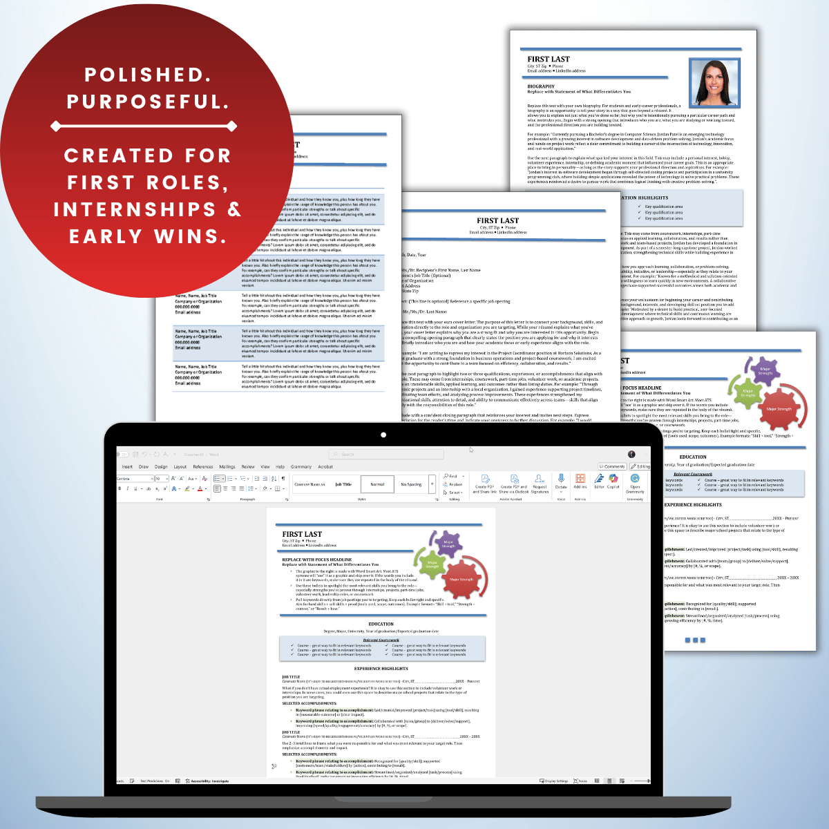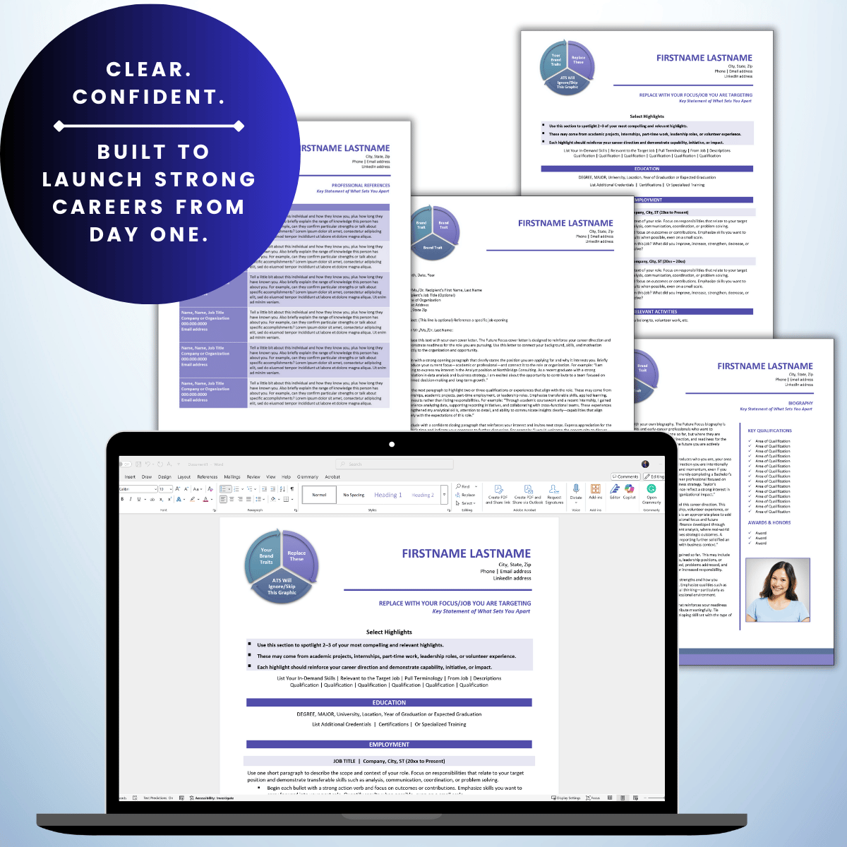 The Launchpad Bundle is a complete resume and career-branding system for students, new graduates, and early-career professionals. This discounted bundle includes four full template collections—each with a resume, cover letter, professional bio, and references sheet—designed to make writing, editing, and tailoring your application materials fast and effortless. Built-in tips, prompts, and examples show you exactly what to write and where to put it, so you can create polished, ATS-friendly documents in Microsoft Word with confidence.