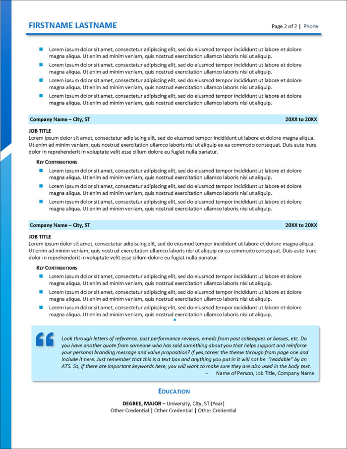 The New Horizons Resume Template is a very flexibly formatted resume template for experienced professionals that is eye-catching and structured in a format that is especially good as a resume template for professionals who have testimonials that they wish to showcase in the resume. The format can also be a great choice for career changers.