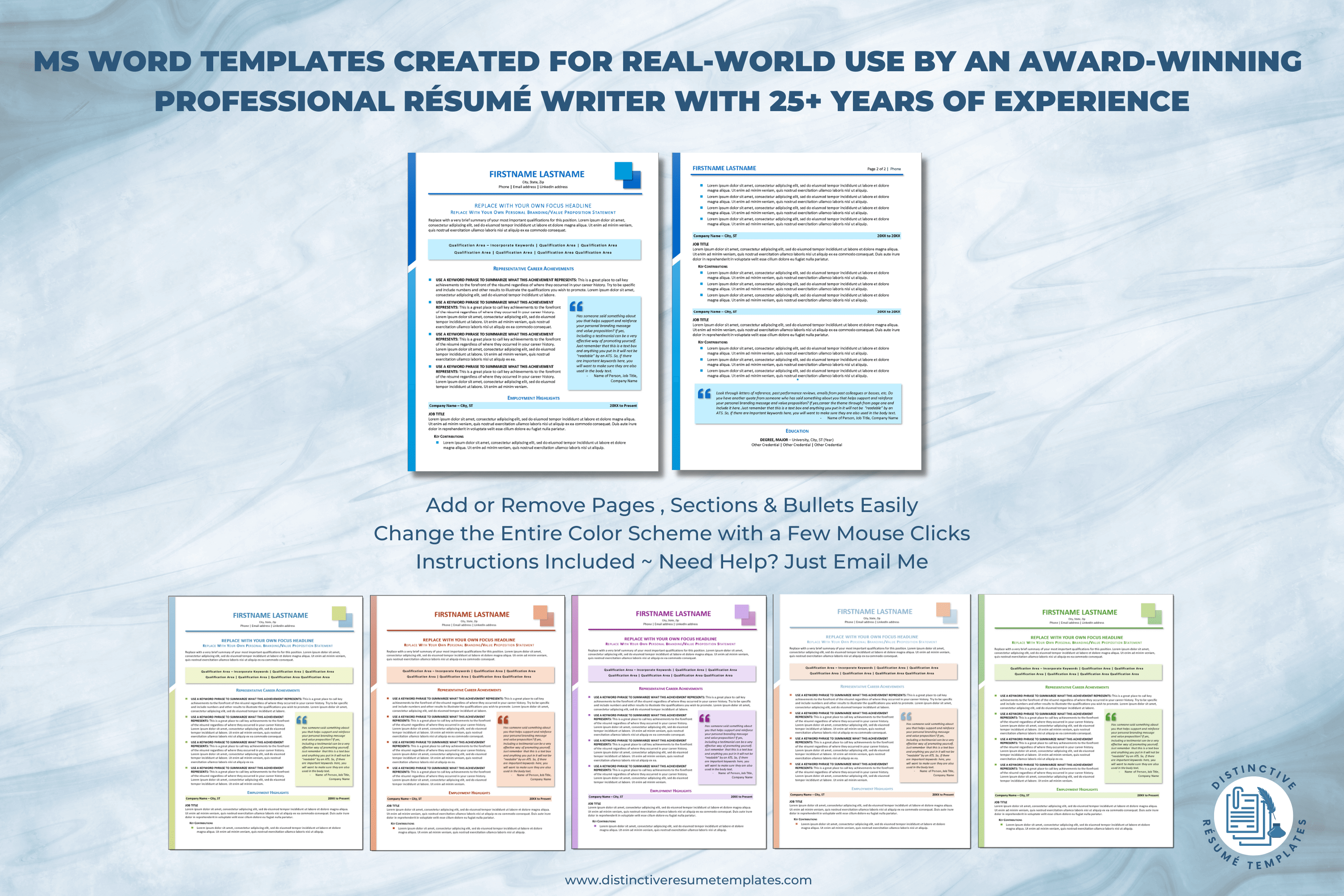 Appearances matter, even with the written word, and how a document looks can make an immediate impact on the decision to read it or toss it aside. I train and mentor many excellent resume writers who have mastered the art of crafting highly effective resume content, but who lack the basic MS Word skills to create eye-catching, ATS compatible and uniquely branded documents. Distinctive Templates are the perfect solution for easily transforming well-written content into works of art that capture attention, generate interest, and motivate the recipient to read every word.